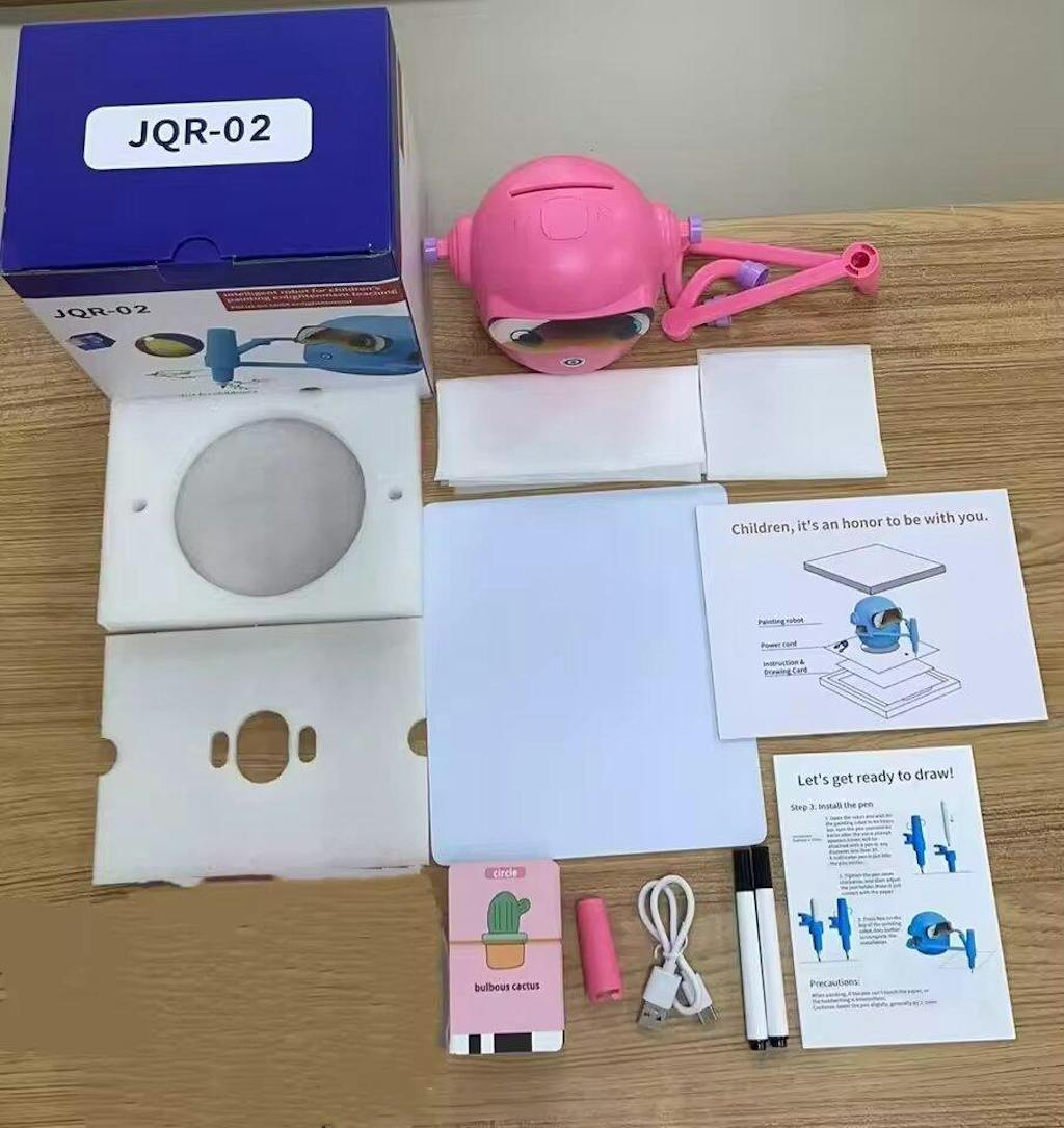 Everything needed for immediate creative play is included: the drawing robot, 100 pattern cards, 2 high-quality pens, a USB charging cable, and a comprehensive instruction manual. The premium ABS plastic construction ensures durability, while the safe electronic components provide reliable performance. This complete package makes it the perfect gift-ready educational toy for any occasion.